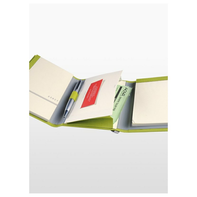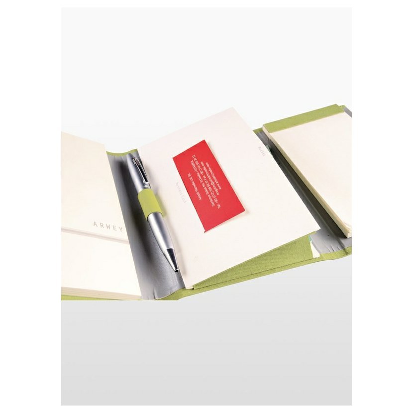 Menší notes flexibilním šitým hřbetem, přetahovací gumou a propisovací tužkou obsahuje dva samostatné