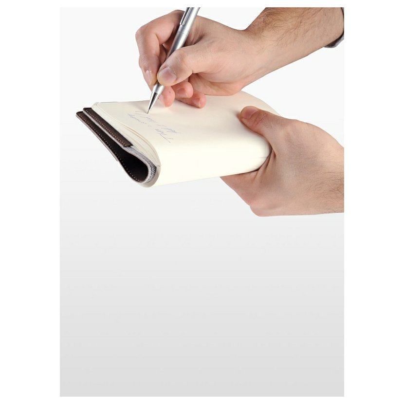 - Flexibilní šitý hřbet, který umožňuje notes překládat napůl, aniž by se při tom rozlomil