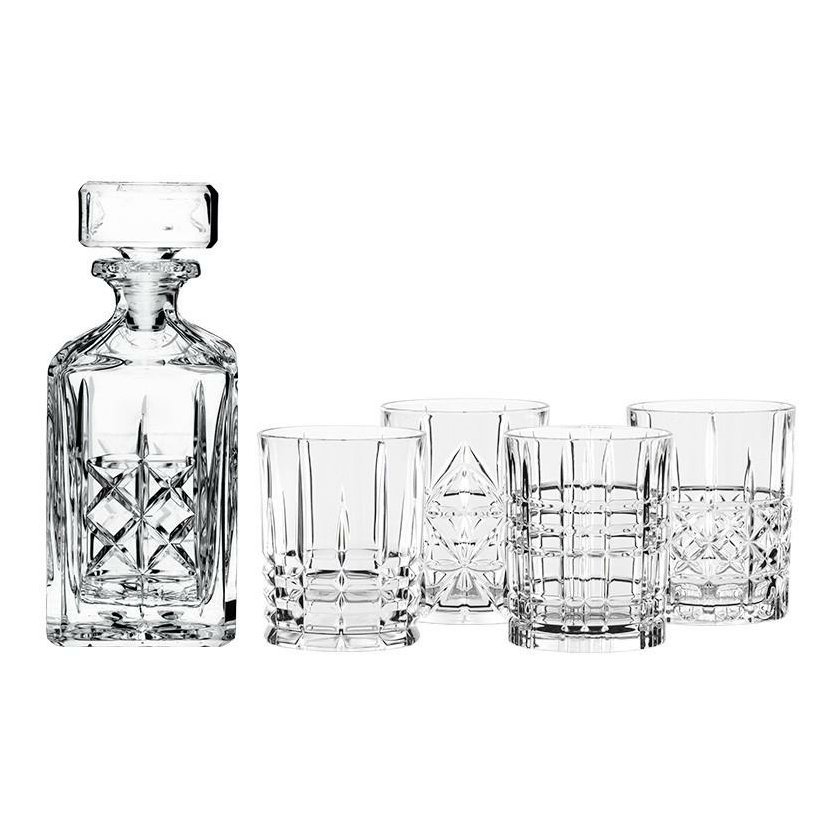 Whisky set 5 kusů ze série Highland německého výrobce Nachtmann zahrnuje 4 sklenice na whisky bez stopky zdobené různými dekory a dekantér na whisky s výraznou dekorativní zátkou.