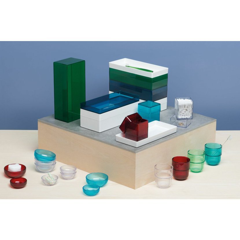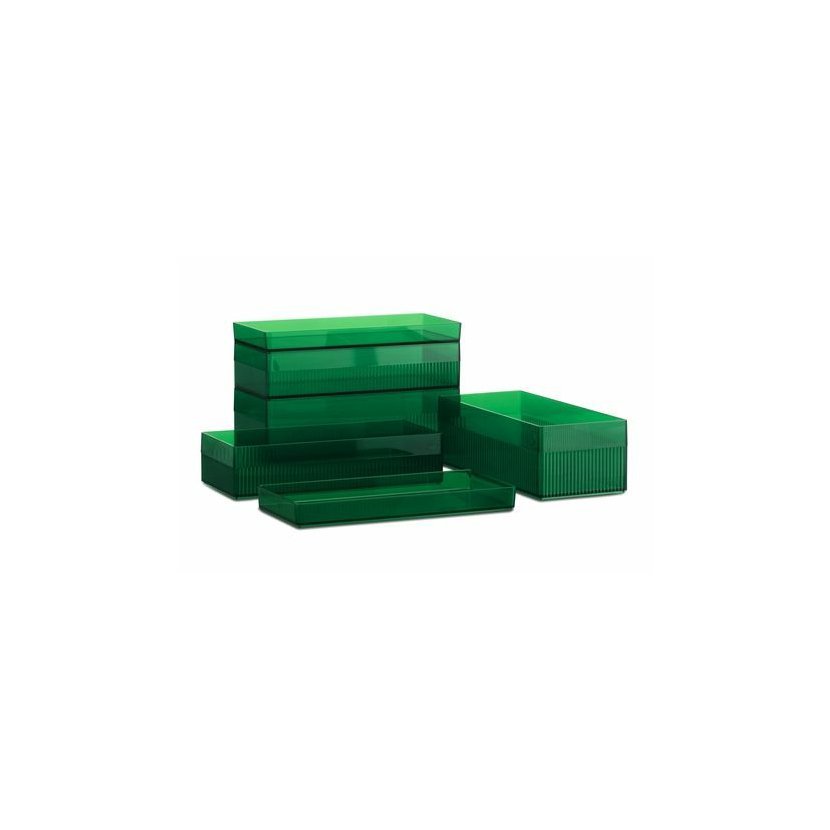 Mělká miska na hřeben, tužky, štětce, gumičky do vlasů, kosmetiku a jiné drobnosti. Kali box S může být také použit jako kryt pro Kali boxy M a L. Stohovatelné Designer: Doshi Levien Šířka: 28,5 cm Výška: 3 cm Hluboké: 12 cm Materiál: Polykarbonát Barva: transparentní zelená