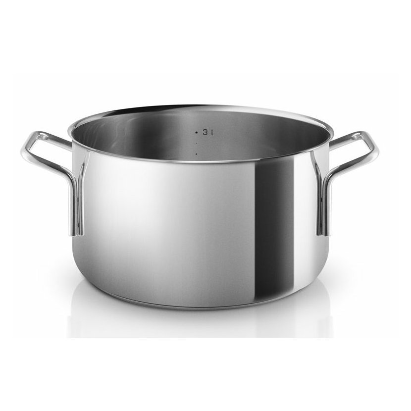 Eva Trio: Rendlíky, kastroly a soté pánve jsou z nerezové oceli 18/10 0,8 mm. Smažicí pánev s nepřilnavým povrchem je z nerezové oceli 18/10 0,6 mm. Uzavřené sendvičové dno z nerezové oceli 18/10 a 5,0 mm hliník; indukční dno 0,5 mm 18/0 ocel; strany 0,8 mm 18/10. Celkem 6,3 mm. Rukojeti: nerezová ocel 18/10. Nýtovací materiál: hliník Nádobí má indukční varnou zónu. Lze mýt v myčce. Design: Ole Palsby