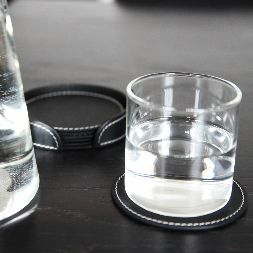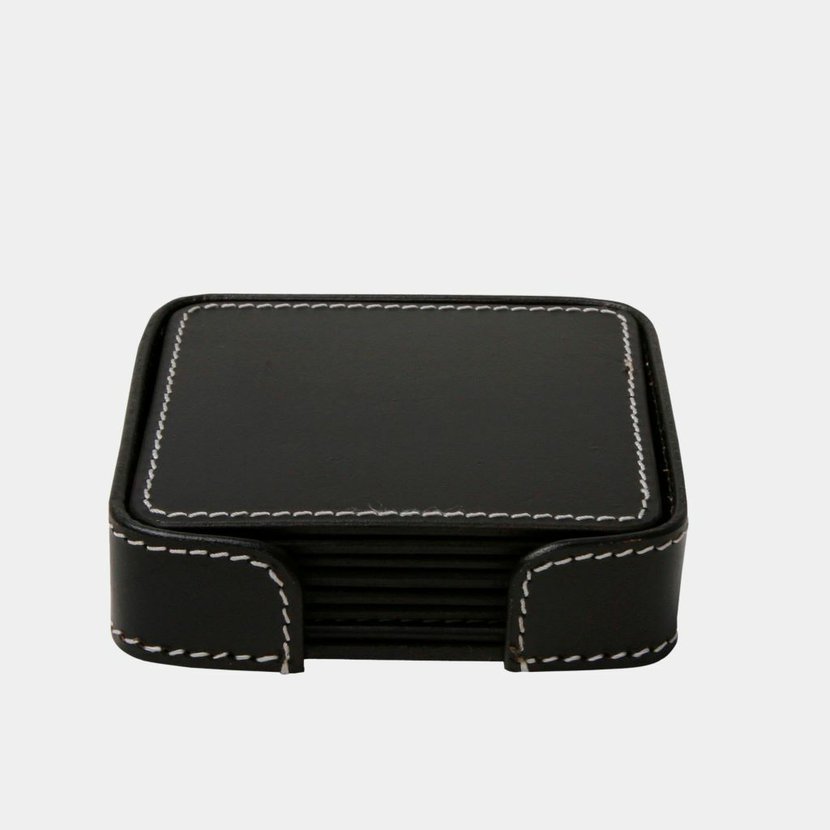 Kožené podtácky v koženém stojánku. Podtácky jsou dodávány v krabičce. Materiál: kůže. Barva: černá. Rozměr: 10x10cm