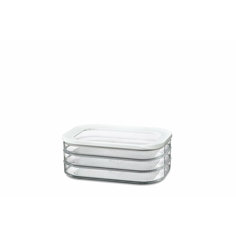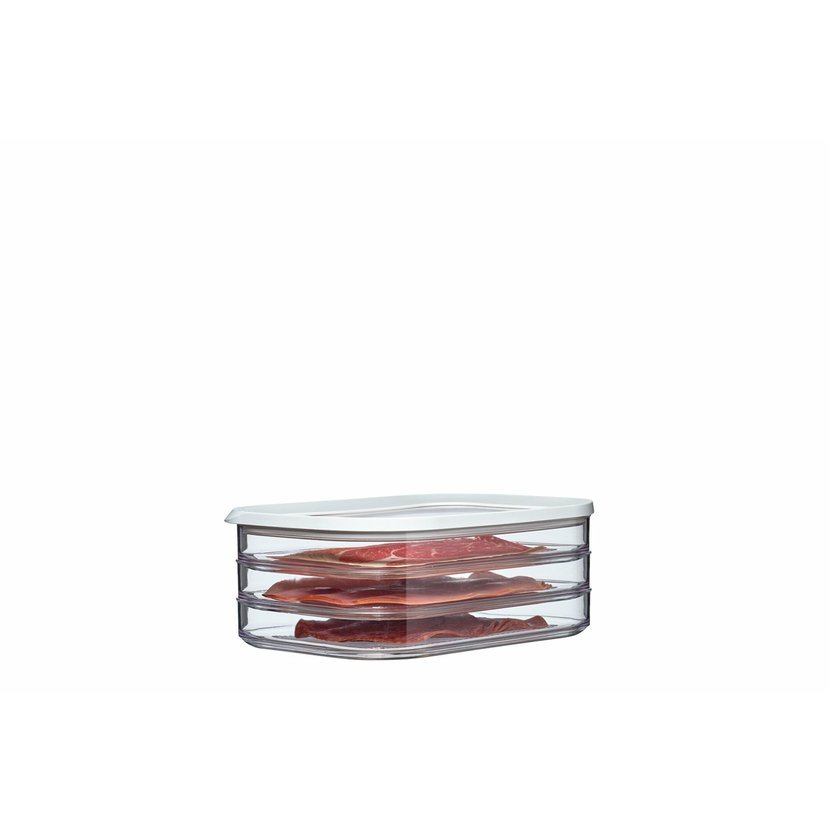 Třípatrový box Modula značky Mepal má průhledné víko s bílým okrajem a zaoblené okraje. Díky průhlednému víku i stěnám vždy vidíte, co je uvnitř. Víko je zároveň vzduchotěsné, tudíž se box hodí ke skladování různých druhů potravin. Box je snadno otevíratelný, praktický, ale také stylový.Box je vhodný na uskladnění různých druhů nakrájených druhů sýrů nebo masa.