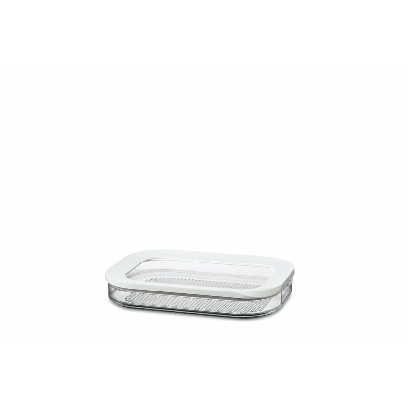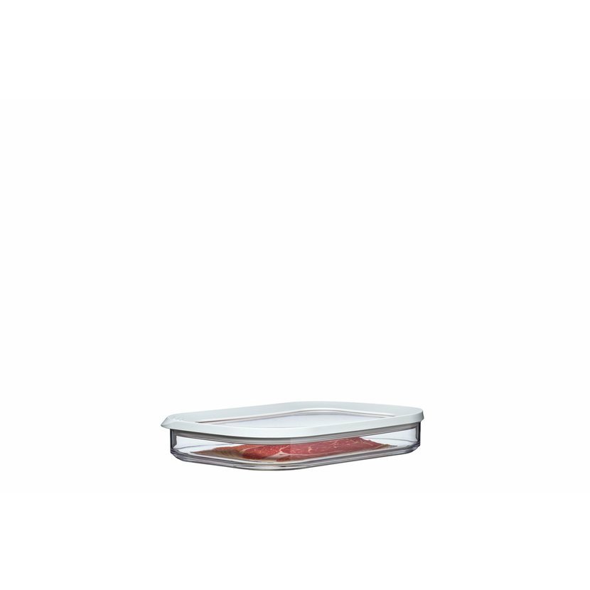 Nízký box Modula značky Mepal má průhledné víko s bílým okrajem a zaoblené okraje. Díky průhlednému víku i stěnám vždy vidíte, co je uvnitř. Víko je zároveň vzduchotěsné, tudíž se box hodí ke skladování různých druhů potravin. Box je snadno otevíratelný, praktický, ale také stylový.