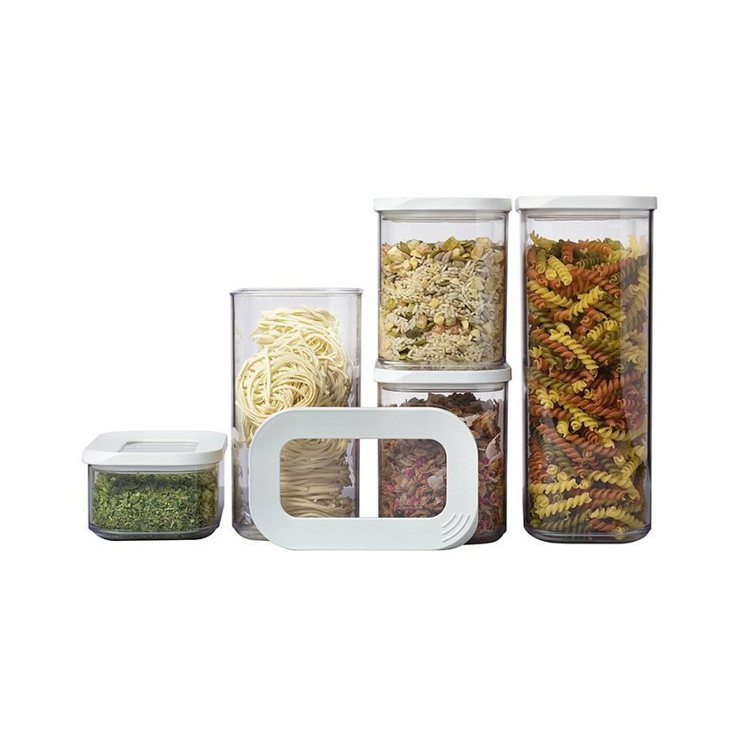 Tato praktická sada Modula se skládá z 1 x 2000 ml, 1 x 1500 ml, 2 x 1000 ml a 1 x 425 ml. Díky průhlednému víku i boxu můžete potraviny skladovat ve skříni nebo v zásuvce. Bílý okraj poskytuje dokonalé uchycení, díky kterému jsou tyto boxy ideální pro skladování sušených potravin, jako je káva, mouka, sušenky, koření a těstoviny. Úložné boxy Modula od společnosti Mepal jsou k dispozici v různých tvarech a velikostech, snadno se otevírají, stohují a lze mýt v myčce. Díky vynikajícím praktickým funkcím v kombinaci se stylovým designem má Modula všechno!