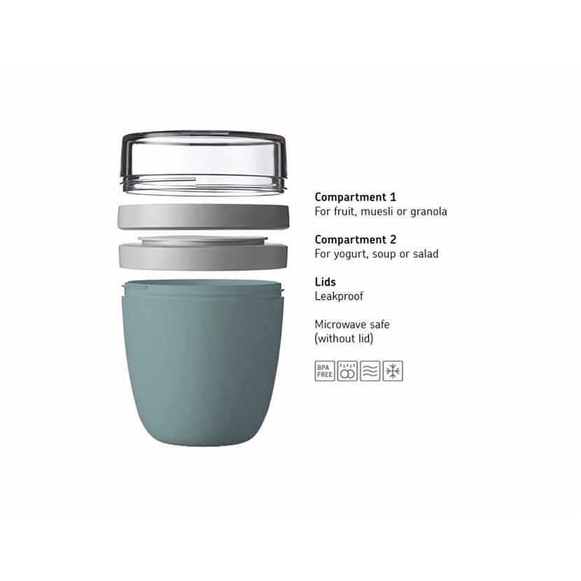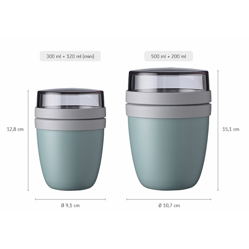 Nádoba na jídlo mini je ideální na jídlo, jako je jogurt s müsli nebo polévka s krutony. Dvě chytré přihrádky, jedna chytrá nádoba. Díky dvěma různým přihrádkám zůstanou vaše ingredience pěkně oddělené. Tento malý kelímek na jídlo je také skvělý pro vašeho syna nebo dceru, protože si ho mohou snadno vzít s sebou do školy!