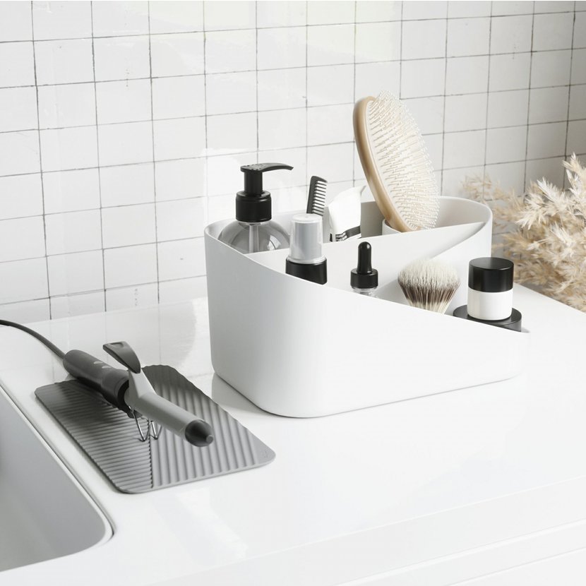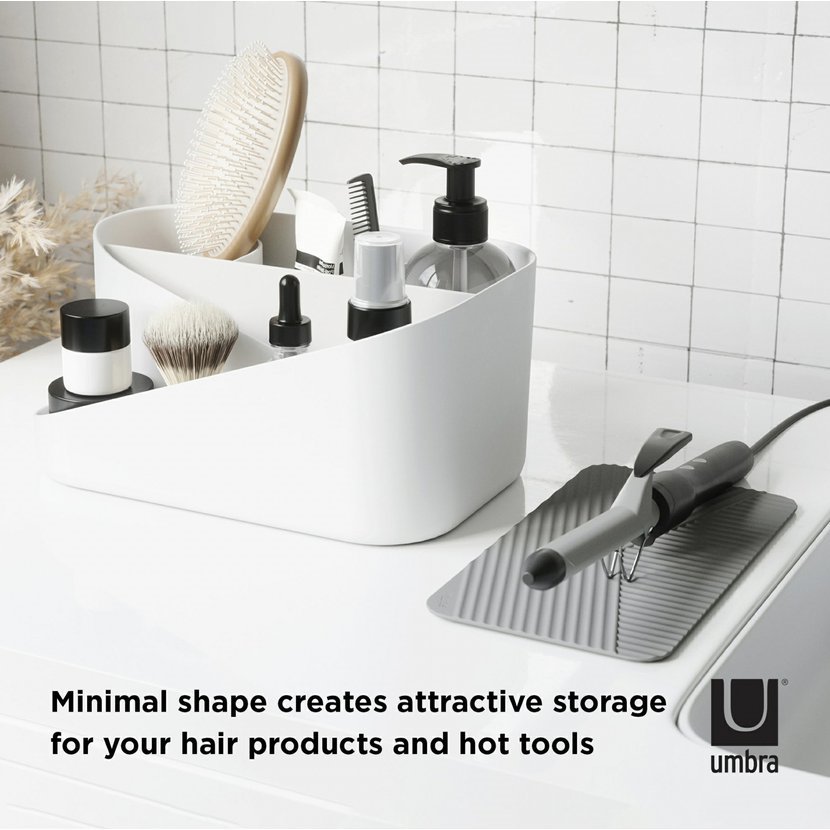 Glam, který chrání váš prostor před poškozením teplem, přichází s odnímatelnou silikonovou žáruvzdornou podložkou pro vaše horké nástroje, kterou lze umístit vedle nebo v organizéru. Tento organizér na nástroje na vlasy, který okamžitě uklidí vaši pracovní desku nebo toaletní potřeby, poskytuje prostorově úsporné úložiště a zároveň zůstává stylový díky svému modernímu a jednoduchému designu.