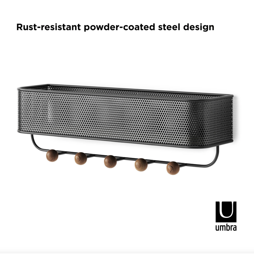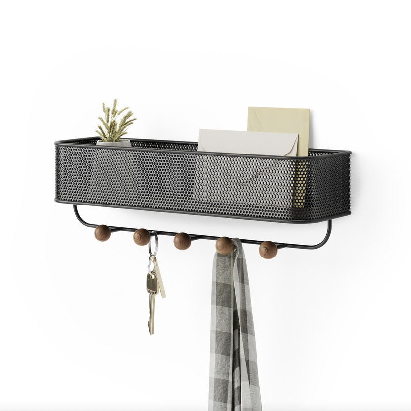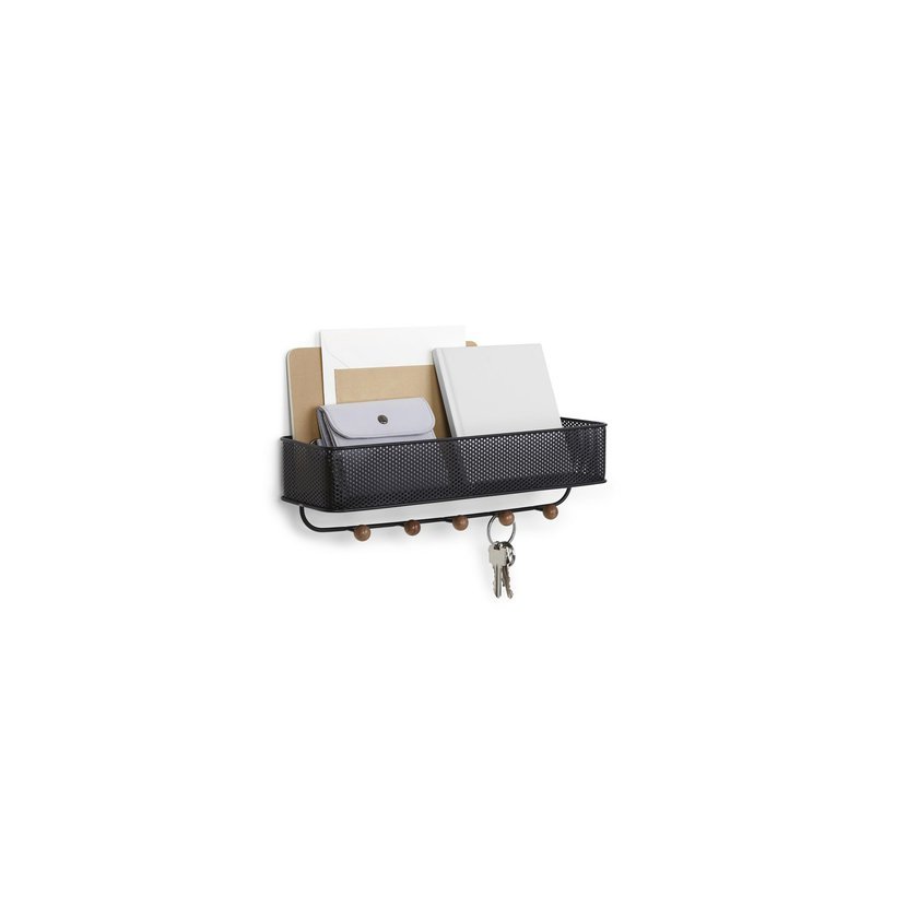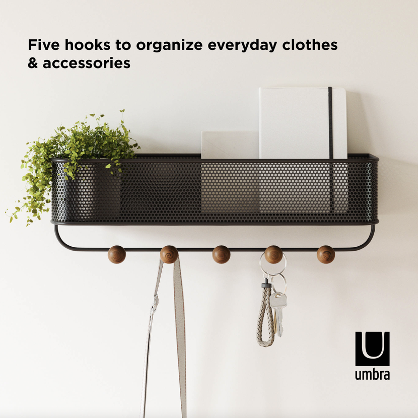 Nástěnný organizér s poličkou ESTIQUE. Víceúčelový věšák na zeď s kovovým košem na dopisy a jiné drobné předměty s 5 háčky s dřevěnými knoflíky, které využijete k pověšení klíčů, vodítek pro psy, klobouků nebo např. šátků.