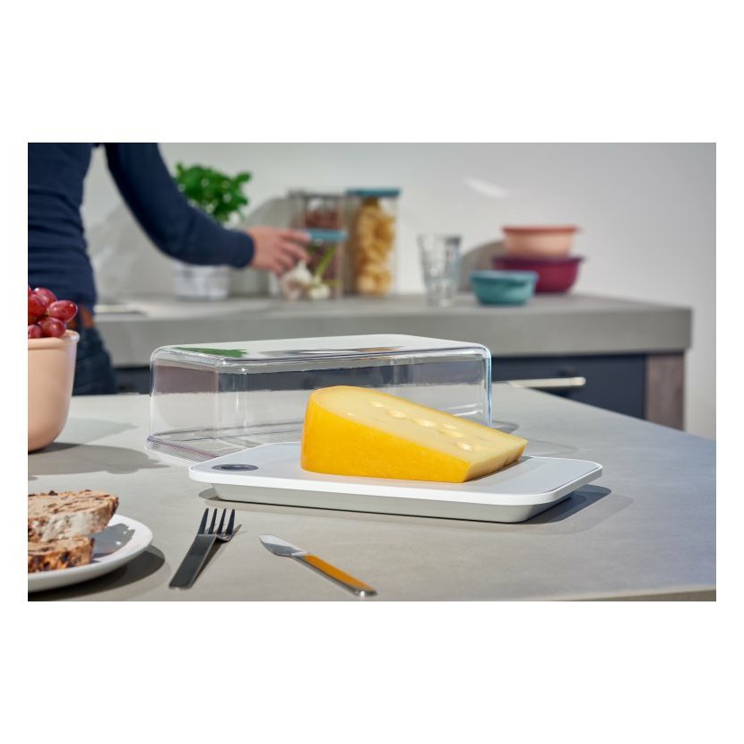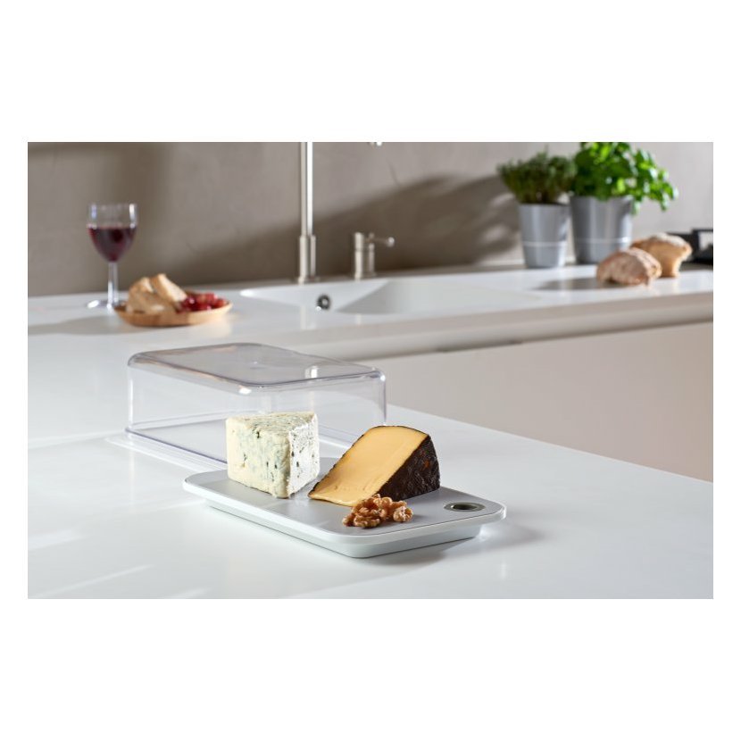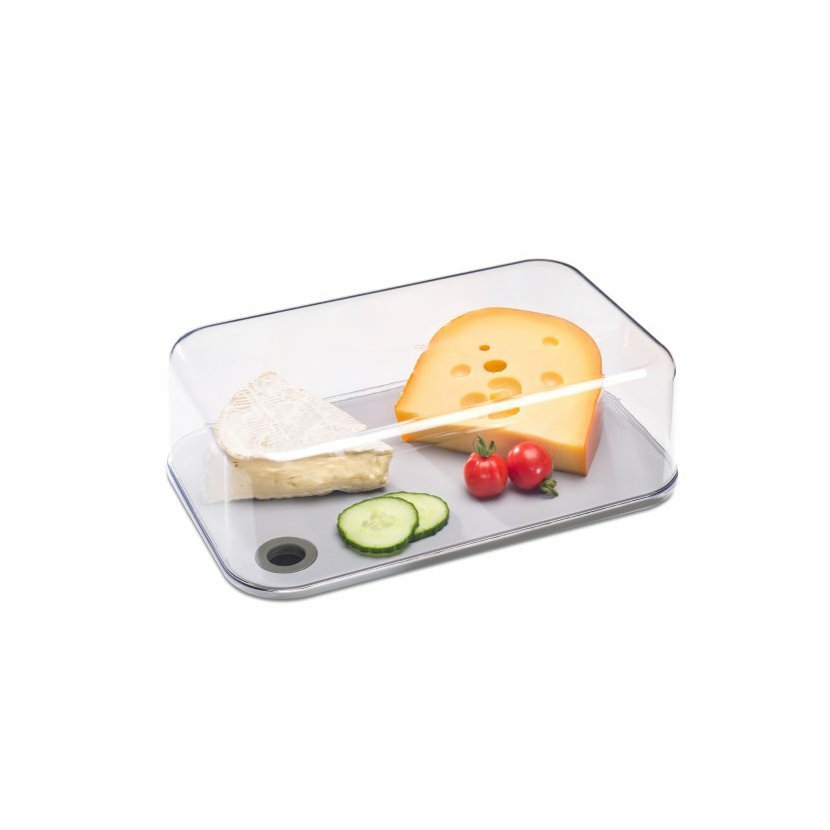 Servírovací box Modula na sýry má průhledné víko, díky kterému vždy vidíte, co je uvnitř. Víko dobře těsní, a proto můžete v boxu skladovat spoustu druhů sýrů a případný nepříjemný zápach zůstane vždy uvnitř. Box má také šedivé prkénko, které můžete snadno vyjmout. Servírovací box je praktický a zároveň velice elegantní.