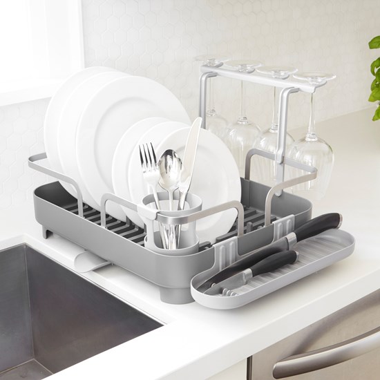 Variabilní odkapávač na nádobí, sestávající z ocelového rámu a plastového podnosu.