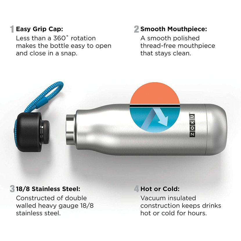 Termoska z ušlechtilé oceli zaručuje, že studené nápoje zůstávají studené až 30 hodin. Horké nápoje neztrácejí páru a udržují si teplotu až 10 hodin. Tato láhev s dvojitými stěnami je zhotovena z nerezové oceli 18/8, přesto zůstává snadno nositelná s odnímatelným šňůrkou. Materiál: nerezová ocel, polypropylen Péče: Ruční mytí, Nepoužívejte myčku Kapacita: 350ml Rozměry: 21x7x7cm Neobsahuje BPA a ftaláty 1. Používejte pro teplé nebo studené nápoje 2. Očistěte ručně kartáčkem a teplým mýdlem a vodou. Nepoužívejte myčku nádobí 3. Nechte otevřené až do úplného vysušení 4. Před prvním použitím umyjte